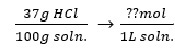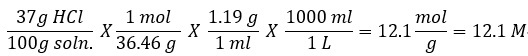 37%(w/w) HCl soln. 몰농도(M)? (HCl F.W=36.46 , 37% HCl 밀도 = 1.19g/ml)