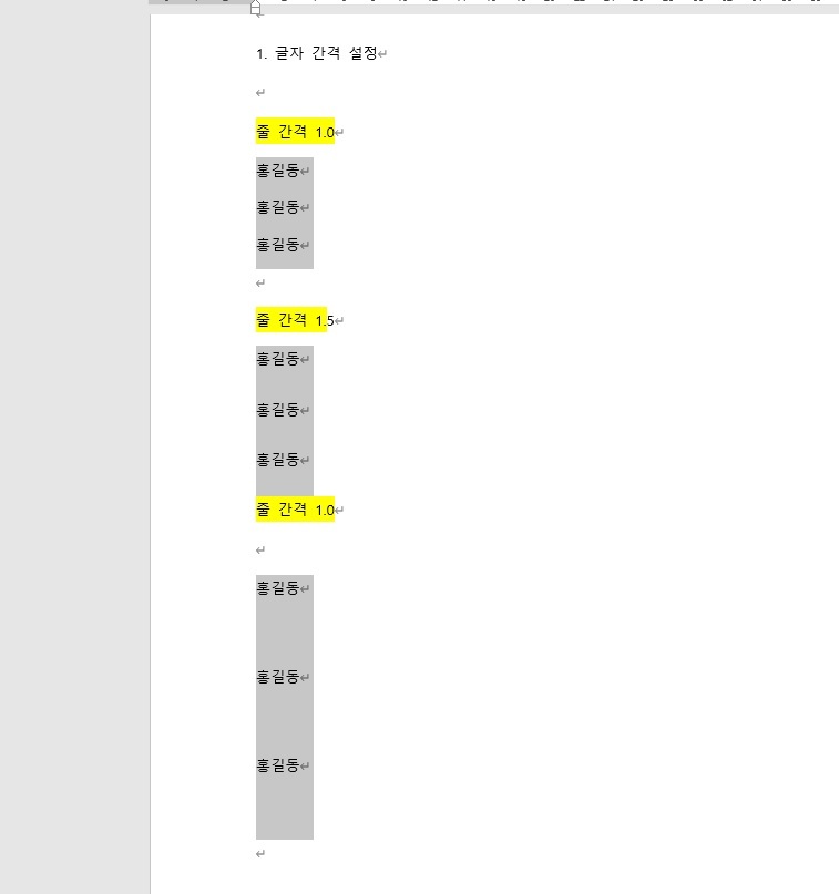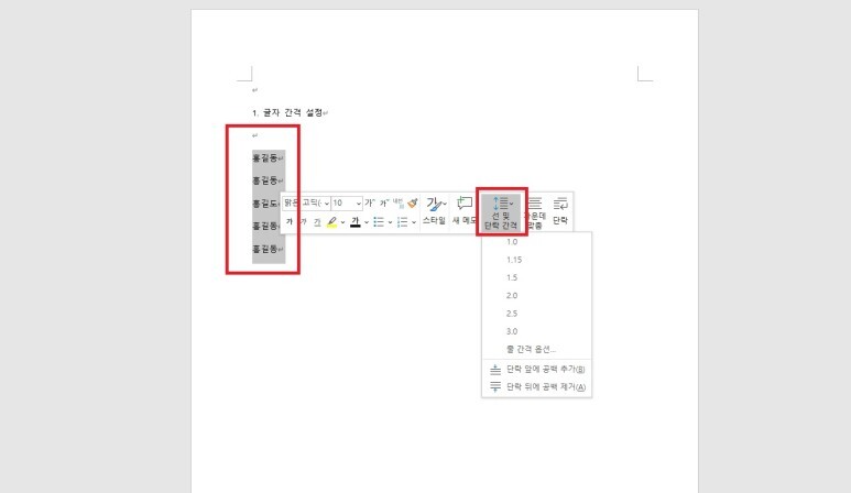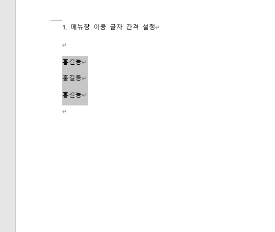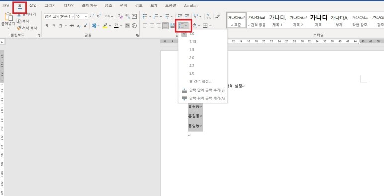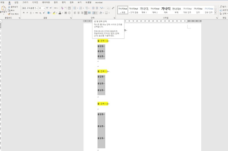 [Word] 메뉴창을 이용한 글의 간격 설정