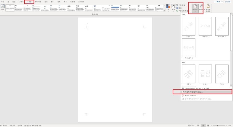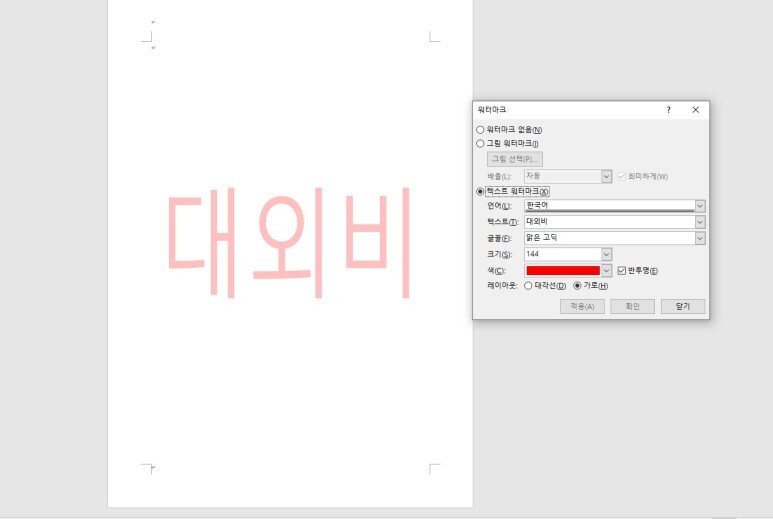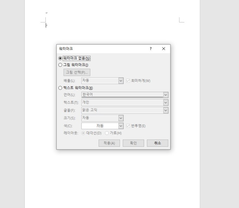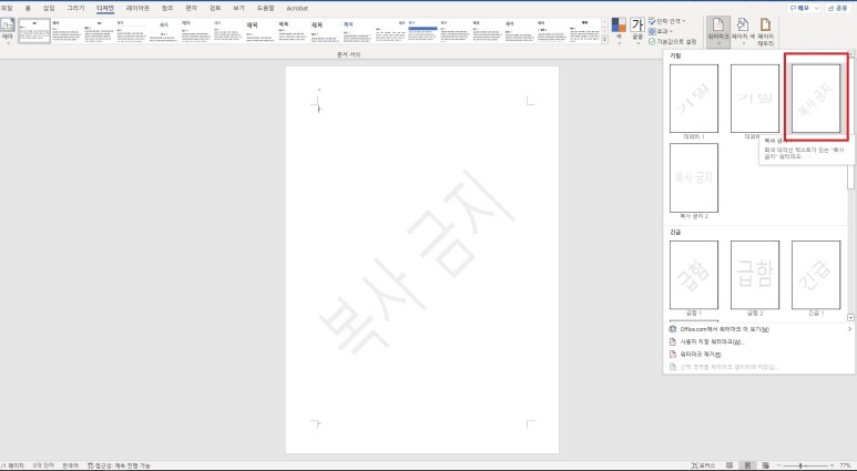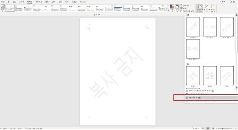 [Word] 메뉴창을 이용한 ' 워터마크 표시 - 기본 ' 설정