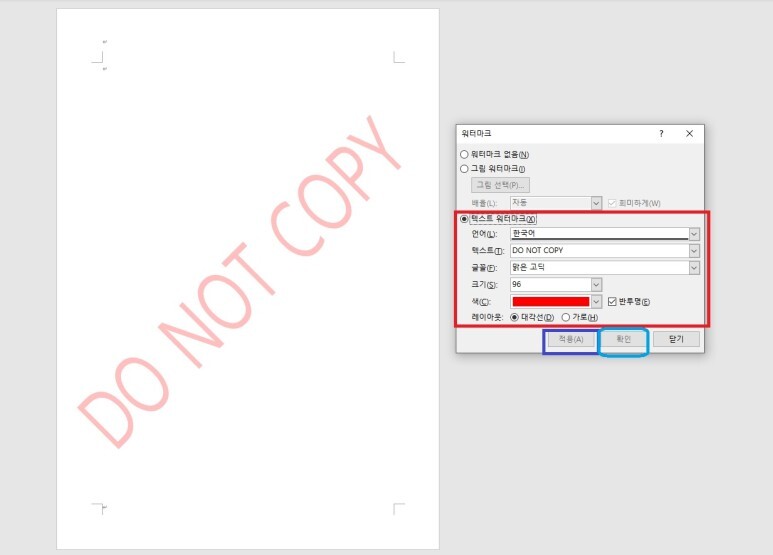 ' 워터마크 표시 - 사용자 지정 : 텍스트 워터마크 ' 설정