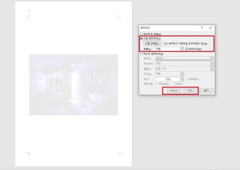' 워터마크 표시 - 사용자 지정 : 그림 워터마크 ' 설정
